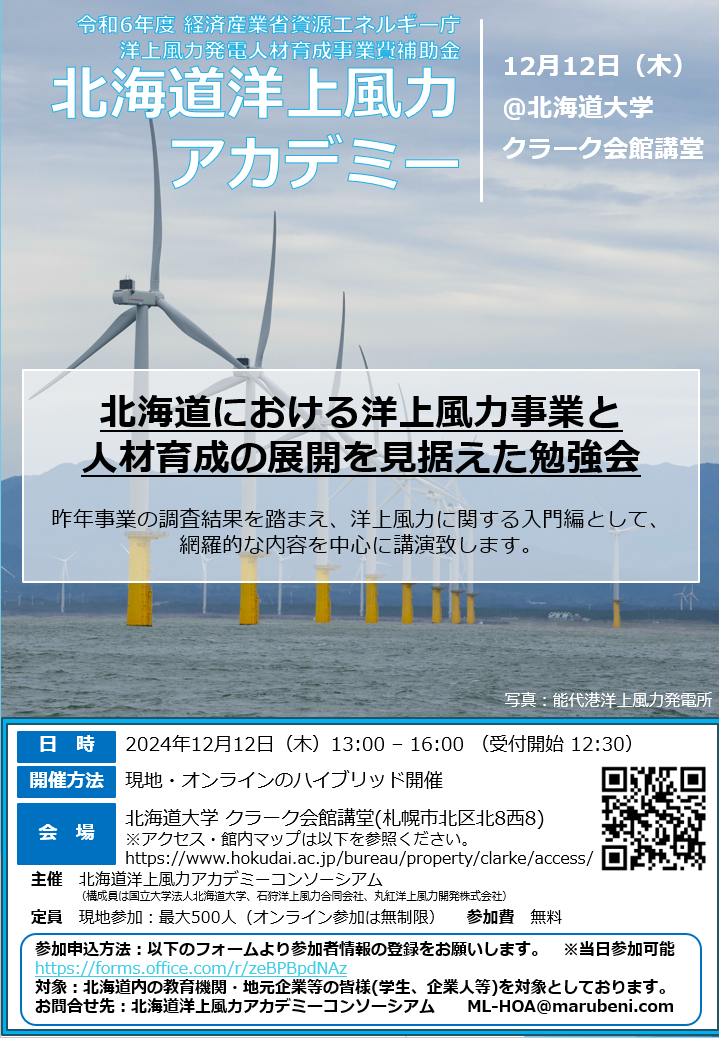 2024年12月12日(木)に、北海道大学クラーク会館講堂にて、前年度に引き続き、道内企業・教育機関の洋上風力産業への理解醸成を目的に「北海道における洋上風力事業と人材育成の展開を見据えた勉強会」を開催いたしました。